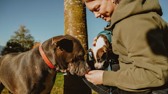 Woman with dog and puppy saying hello