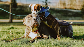 Puppy playing with Pitbull in grass